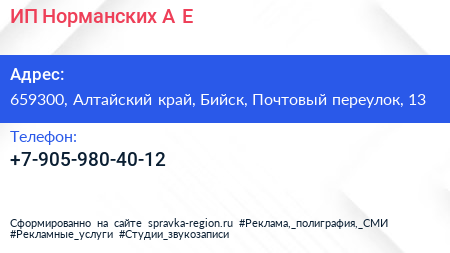 ИП Норманских А.Е. по адресу 659300, Алтайский край, Бийск, Почтовый переулок, 13 в дальнейшем Организация, размещена в следующих категориях: