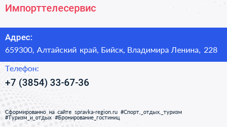 Импорттелесервис по адресу 659300, Алтайский край, Бийск, Владимира Ленина, 228 в дальнейшем Организация, размещена в следующих категориях: