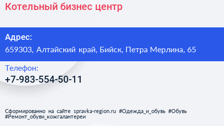 Котельный, бизнес-центр по адресу 659303, Алтайский край, Бийск, Петра Мерлина, 65 в дальнейшем Организация, размещена в следующих категориях:
