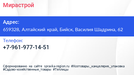 Мирастрой по адресу 659328, Алтайский край, Бийск, Василия Шадрина, 62 в дальнейшем Организация, размещена в следующих категориях: