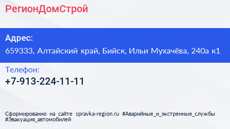 РегионДомСтрой по адресу 659333, Алтайский край, Бийск, Ильи Мухачёва, 240а к1 в дальнейшем Организация, размещена в следующих категориях: