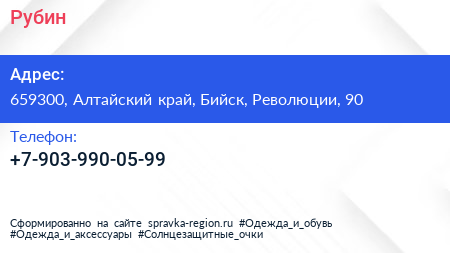 Рубин по адресу 659300, Алтайский край, Бийск, Революции, 90 в дальнейшем Организация, размещена в следующих категориях: