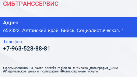 СИБТРАНССЕРВИС по адресу 659322, Алтайский край, Бийск, Социалистическая, 1 в дальнейшем Организация, размещена в следующих категориях: