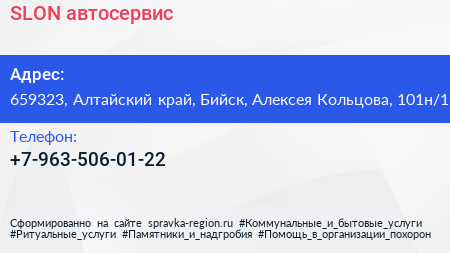 SLON, автосервис по адресу 659323, Алтайский край, Бийск, Алексея Кольцова, 101н/1 в дальнейшем Организация, размещена в следующих категориях: