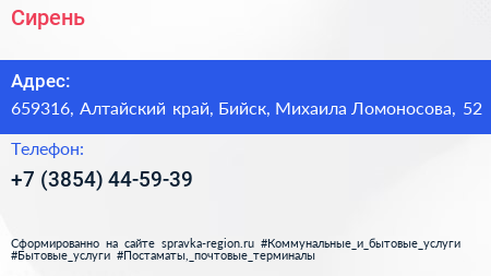 Сирень по адресу 659316, Алтайский край, Бийск, Михаила Ломоносова, 52 в дальнейшем Организация, размещена в следующих категориях: