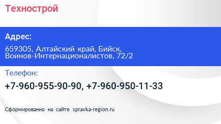 Технострой по адресу 659305, Алтайский край, Бийск, Воинов-Интернационалистов, 72/2 в дальнейшем Организация, размещена в следующих категориях:
