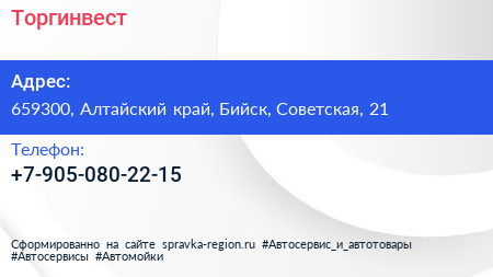 Торгинвест по адресу 659300, Алтайский край, Бийск, Советская, 21 в дальнейшем Организация, размещена в следующих категориях: