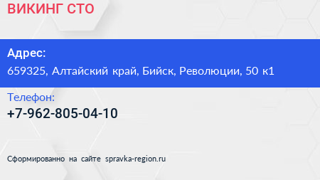 ВИКИНГ, СТО по адресу 659325, Алтайский край, Бийск, Революции, 50 к1 в дальнейшем Организация, размещена в следующих категориях: