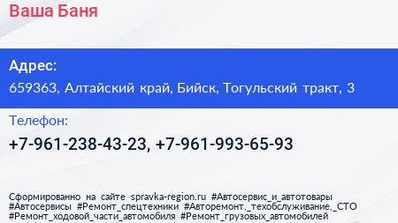 Ваша Баня по адресу 659363, Алтайский край, Бийск, Тогульский тракт, 3 в дальнейшем Организация, размещена в следующих категориях: