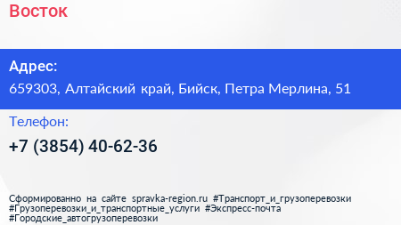 Восток по адресу 659303, Алтайский край, Бийск, Петра Мерлина, 51 в дальнейшем Организация, размещена в следующих категориях: