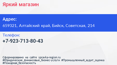 Яркий, магазин по адресу 659321, Алтайский край, Бийск, Советская, 214 в дальнейшем Организация, размещена в следующих категориях: