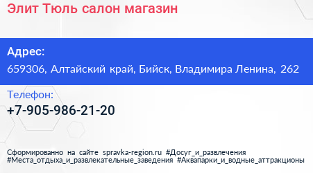 Элит Тюль, салон-магазин по адресу 659306, Алтайский край, Бийск, Владимира Ленина, 262 в дальнейшем Организация, размещена в следующих категориях: