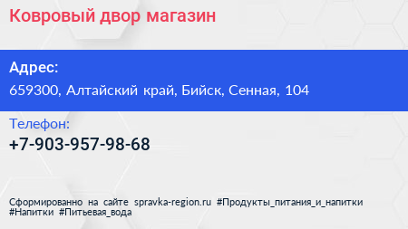 Ковровый двор, магазин по адресу 659300, Алтайский край, Бийск, Сенная, 104 в дальнейшем Организация, размещена в следующих категориях: