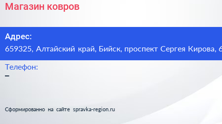 Магазин ковров по адресу 659325, Алтайский край, Бийск, проспект Сергея Кирова, 6 в дальнейшем Организация, размещена в следующих категориях: