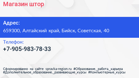 Магазин штор по адресу 659300, Алтайский край, Бийск, Советская, 40 в дальнейшем Организация, размещена в следующих категориях: