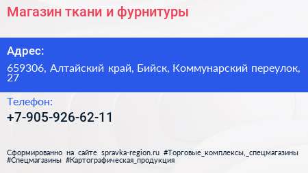 Магазин ткани и фурнитуры по адресу 659306, Алтайский край, Бийск, Коммунарский переулок, 27 в дальнейшем Организация, размещена в следующих категориях: