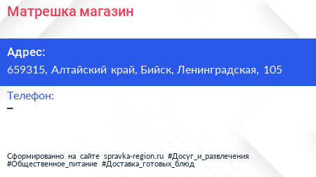 Матрешка, магазин по адресу 659315, Алтайский край, Бийск, Ленинградская, 105 в дальнейшем Организация, размещена в следующих категориях: