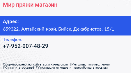 Мир пряжи, магазин по адресу 659322, Алтайский край, Бийск, Декабристов, 15/1 в дальнейшем Организация, размещена в следующих категориях: