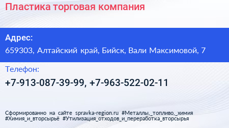 Пластика, торговая компания по адресу 659303, Алтайский край, Бийск, Вали Максимовой, 7 в дальнейшем Организация, размещена в следующих категориях: