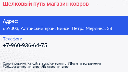 Шелковый путь, магазин ковров по адресу 659303, Алтайский край, Бийск, Петра Мерлина, 38 в дальнейшем Организация, размещена в следующих категориях: