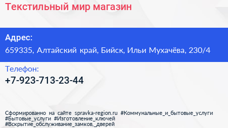 Текстильный мир, магазин по адресу 659335, Алтайский край, Бийск, Ильи Мухачёва, 230/4 в дальнейшем Организация, размещена в следующих категориях: