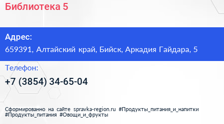 Библиотека №5 по адресу 659391, Алтайский край, Бийск, Аркадия Гайдара, 5 в дальнейшем Организация, размещена в следующих категориях: