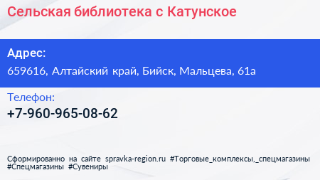 Сельская библиотека, с. Катунское по адресу 659616, Алтайский край, Бийск, Мальцева, 61а в дальнейшем Организация, размещена в следующих категориях: