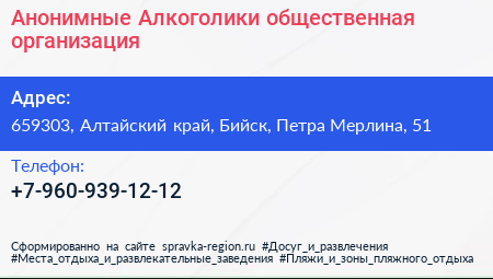 Анонимные Алкоголики, общественная организация по адресу 659303, Алтайский край, Бийск, Петра Мерлина, 51 в дальнейшем Организация, размещена в следующих категориях: