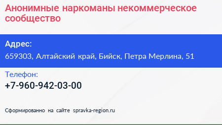 Анонимные наркоманы, некоммерческое сообщество по адресу 659303, Алтайский край, Бийск, Петра Мерлина, 51 в дальнейшем Организация, размещена в следующих категориях: