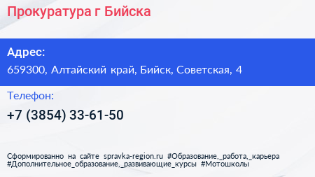 Прокуратура г. Бийска по адресу 659300, Алтайский край, Бийск, Советская, 4 в дальнейшем Организация, размещена в следующих категориях: