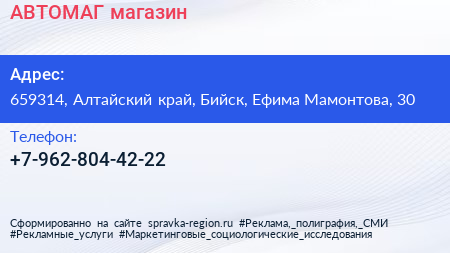 АВТОМАГ, магазин по адресу 659314, Алтайский край, Бийск, Ефима Мамонтова, 30 в дальнейшем Организация, размещена в следующих категориях: