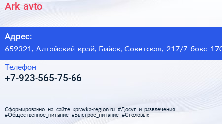 Ark-avto по адресу 659321, Алтайский край, Бийск, Советская, 217/7 бокс 170 в дальнейшем Организация, размещена в следующих категориях: