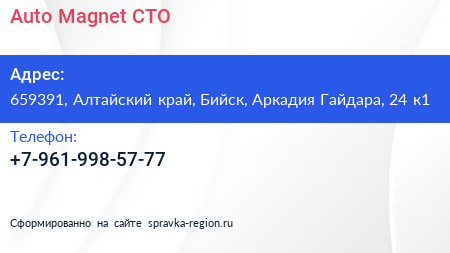 Auto Magnet, СТО по адресу 659391, Алтайский край, Бийск, Аркадия Гайдара, 24 к1 в дальнейшем Организация, размещена в следующих категориях: