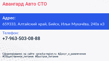 Авангард-Авто, СТО по адресу 659333, Алтайский край, Бийск, Ильи Мухачёва, 240а к3 в дальнейшем Организация, размещена в следующих категориях: