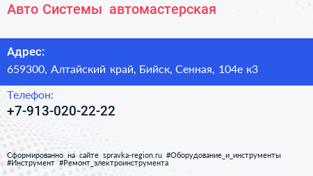 Авто-Системы+, автомастерская по адресу 659300, Алтайский край, Бийск, Сенная, 104е к3 в дальнейшем Организация, размещена в следующих категориях: