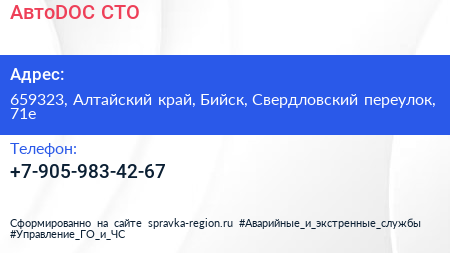 АвтоDOC, СТО по адресу 659323, Алтайский край, Бийск, Свердловский переулок, 71е в дальнейшем Организация, размещена в следующих категориях: