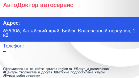 АвтоДоктор, автосервис по адресу 659306, Алтайский край, Бийск, Кожевенный переулок, 1 к2 в дальнейшем Организация, размещена в следующих категориях:
