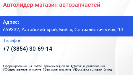 Автолидер, магазин автозапчастей по адресу 659332, Алтайский край, Бийск, Социалистическая, 13 в дальнейшем Организация, размещена в следующих категориях: