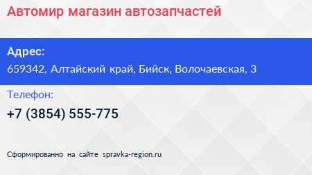 Автомир, магазин автозапчастей по адресу 659342, Алтайский край, Бийск, Волочаевская, 3 в дальнейшем Организация, размещена в следующих категориях: