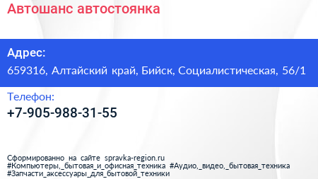 Автошанс, автостоянка по адресу 659316, Алтайский край, Бийск, Социалистическая, 56/1 в дальнейшем Организация, размещена в следующих категориях: