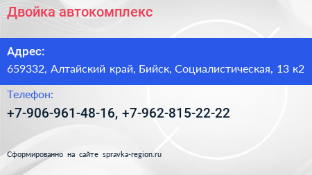 Двойка, автокомплекс по адресу 659332, Алтайский край, Бийск, Социалистическая, 13 к2 в дальнейшем Организация, размещена в следующих категориях: