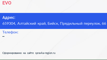 EVO по адресу 659304, Алтайский край, Бийск, Прядильный переулок, 66 в дальнейшем Организация, размещена в следующих категориях: