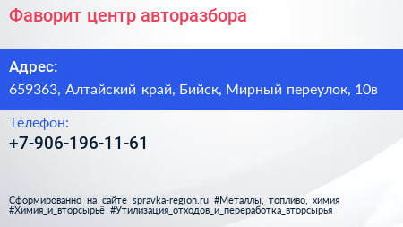 Фаворит, центр авторазбора по адресу 659363, Алтайский край, Бийск, Мирный переулок, 10в в дальнейшем Организация, размещена в следующих категориях: