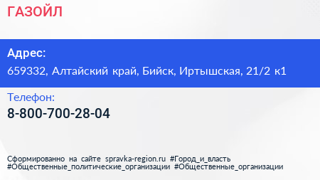 ГАЗОЙЛ по адресу 659332, Алтайский край, Бийск, Иртышская, 21/2 к1 в дальнейшем Организация, размещена в следующих категориях: