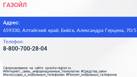 ГАЗОЙЛ по адресу 659330, Алтайский край, Бийск, Александра Герцена, 70/5 в дальнейшем Организация, размещена в следующих категориях: