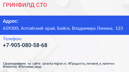 ГРИНФИЛД, СТО по адресу 659300, Алтайский край, Бийск, Владимира Ленина, 123 в дальнейшем Организация, размещена в следующих категориях: