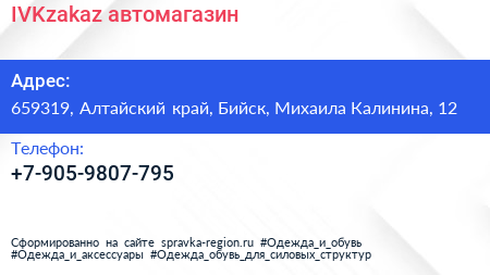 IVKzakaz, автомагазин по адресу 659319, Алтайский край, Бийск, Михаила Калинина, 12 в дальнейшем Организация, размещена в следующих категориях: