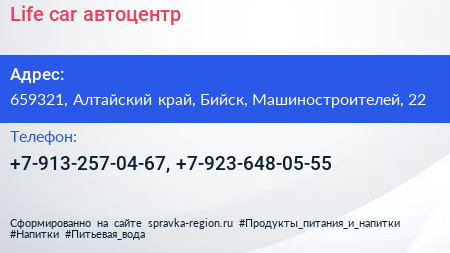 Life car, автоцентр по адресу 659321, Алтайский край, Бийск, Машиностроителей, 22 в дальнейшем Организация, размещена в следующих категориях: