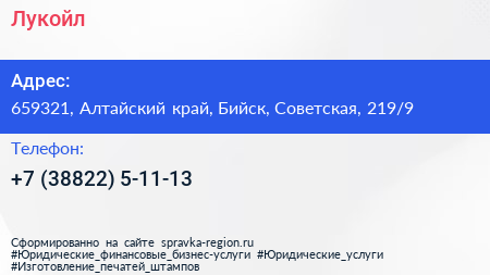 Лукойл по адресу 659321, Алтайский край, Бийск, Советская, 219/9 в дальнейшем Организация, размещена в следующих категориях: