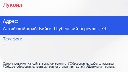 Лукойл по адресу Алтайский край, Бийск, Шубенский переулок, 74 в дальнейшем Организация, размещена в следующих категориях: